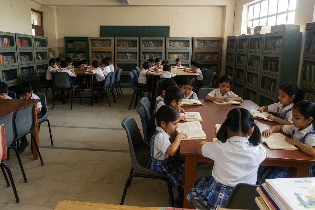 The school has a well maintained library with about 12,000 books on diverse genres such as text books, fiction, sports etc along with several educational magazines such as Outlook, Competition Review etc and three different daily newspapers. There is a mandatory library period for each class to promote reading habits among students.